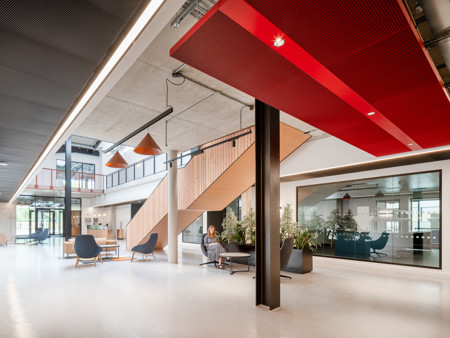 The building features a mix of SAS metal ceiling solutions, including bold Flame Red SAS600 mesh rafts that help define corridors, alongside SAS150 within the lab spaces to provide convenient access.